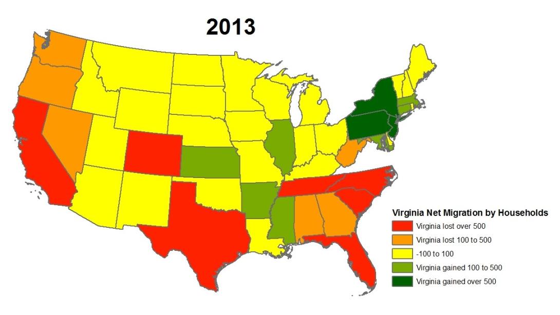 However, last month the I.R.S. released migration data for 2012 and 2013 showing that this trend may have come to an end. After having slightly more households move into the state than out in 2012, Virginia had over 3,000 more households leave the state in 2013 than moved in. I.R.S. data is particularly useful for examining these year to year migration changes since it’s based on administrative income tax data (which tracks the filers’ addresses) rather than surveys which can have high margins of error.
