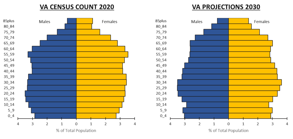 The latest projections also highlight the shifting age composition in Virginia, with the statewide share of the older adult population (those aged 65 and above) showing continued growth from 12% in 2010, to 16% in 2020, to 19% in 2030 and beyond.