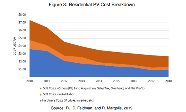Distributed solar generation can contribute to the decarbonization of state economies, but the relatively high soft costs – the non-hardware expenses of installing a solar system – remain a key barrier to more widespread solar energy adoption. In 2018, soft costs made up 63% of the total price tag that homeowners could expect to pay when installing a new system. Hardware costs have fallen rapidly over the last decade, decreasing from $3.64/W to $0.99/W, meaning that soft costs make up a growing share of solar’s total cost. Reducing the overall cost of solar by reducing soft costs will make solar energy generation a more attractive option moving forward.